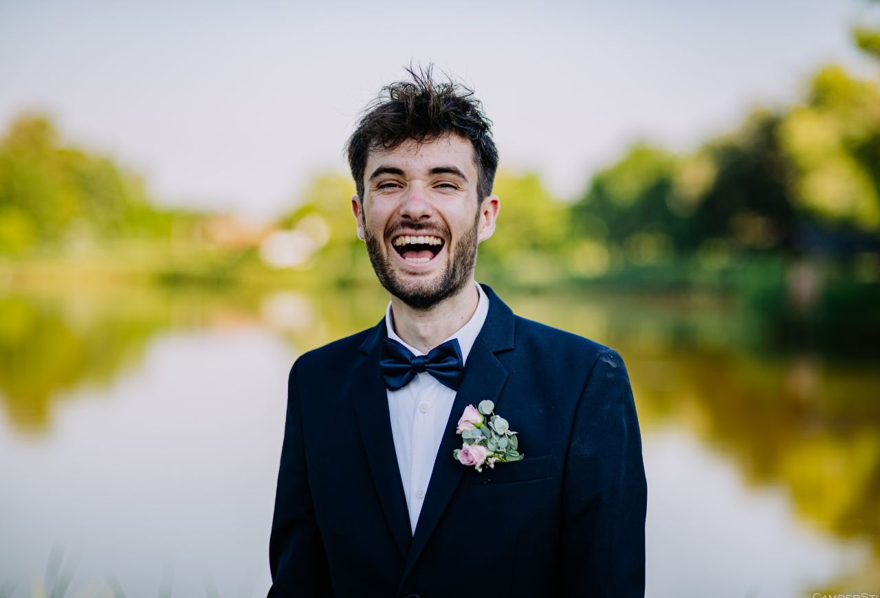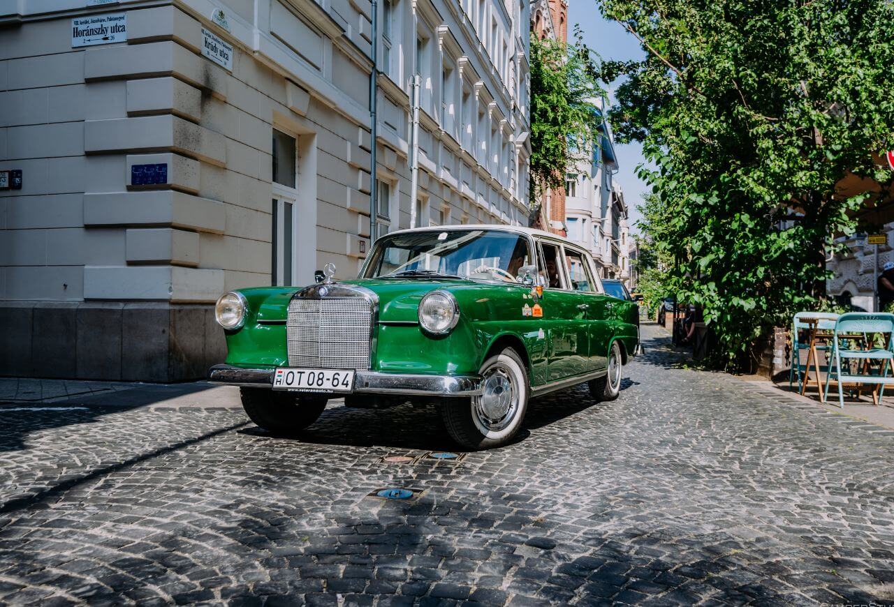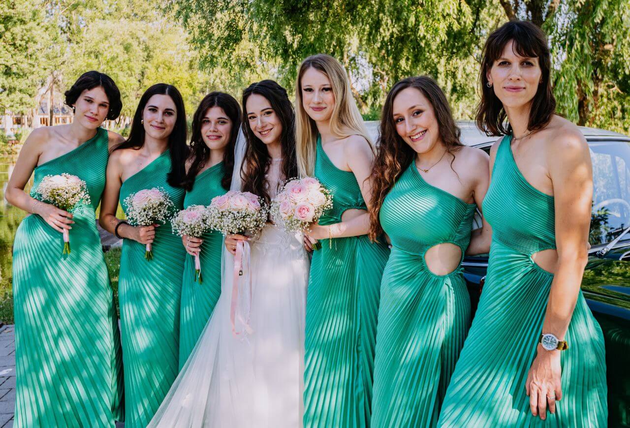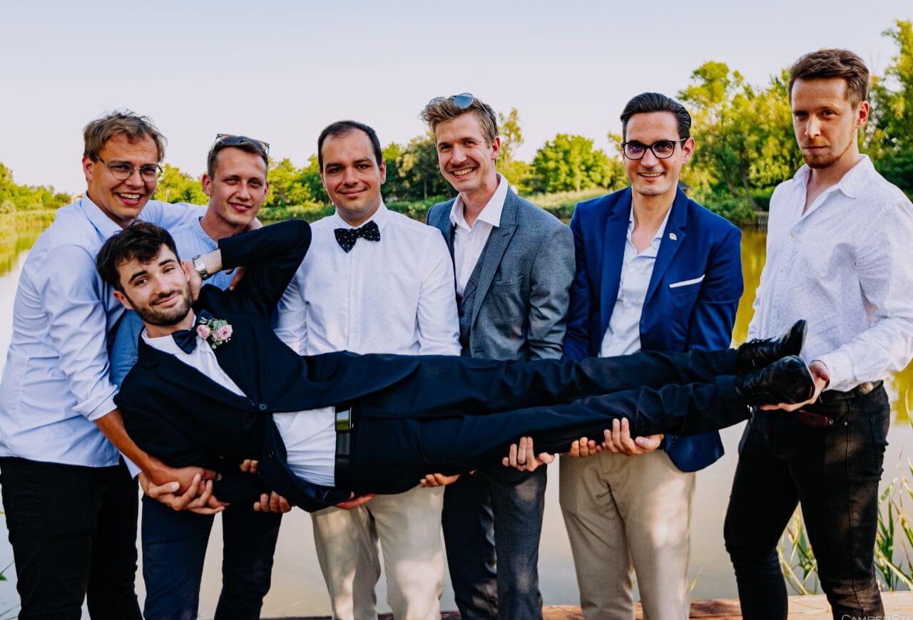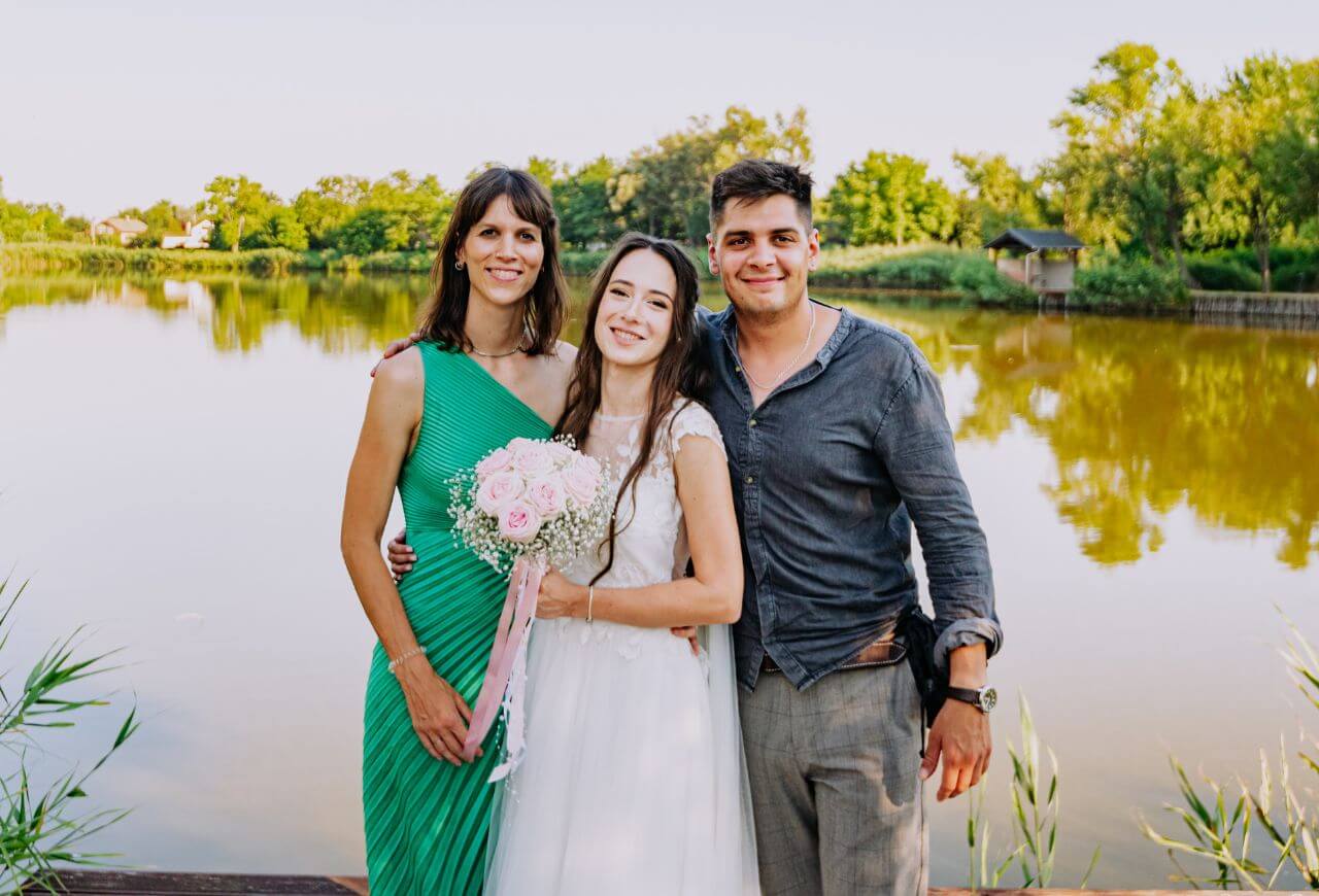 A szertartás után Eszter és Marci egy gyönyörű, mélyzöld veterán Mercedes autóval gurultak át a Péteri-majorhoz, a Péteri Rendezvényparkba. Itt, a tó partján tartottuk meg a kreatív fotózás első felvonását, mivel a festői környezet és a jó hangulat garantált volt, a csoportképek elkészítésére is sort kerítettünk. A tó, a zöldellő fák és a napsütés tökéletes hátteret biztosítottak egy örök emléket adó fotósorozathoz.